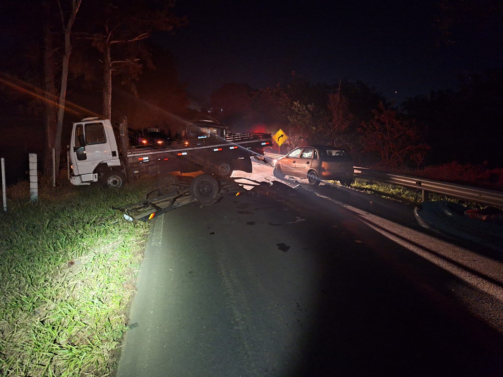 Segundo a Polícia Militar Rodoviária (PMRv/SC), tudo começou quando um carro que puxava um reboque com um barco tentou uma ultrapassagem perigosa. O motorista não conseguiu voltar totalmente para a pista, e o reboque acabou batendo em um caminhão. Na sequência, o impacto atingiu outro carro que vinha no sentido contrário. Logo depois, outro caminhão colidiu na traseira do caminhão envolvido.