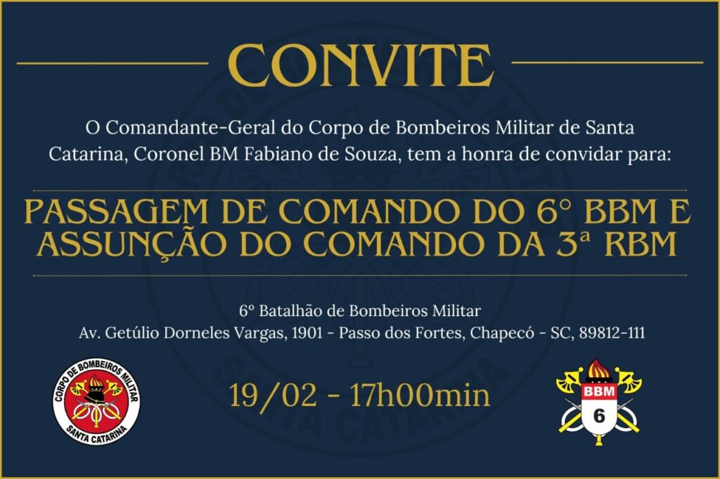 O Corpo de Bombeiros Militar de Santa Catarina realizará, no dia 19 de fevereiro, a cerimônia oficial de passagem de comando do 6º Batalhão de Bombeiros Militar (BBM) e a assunção do comando da 3ª Região Bombeiro Militar (RBM).