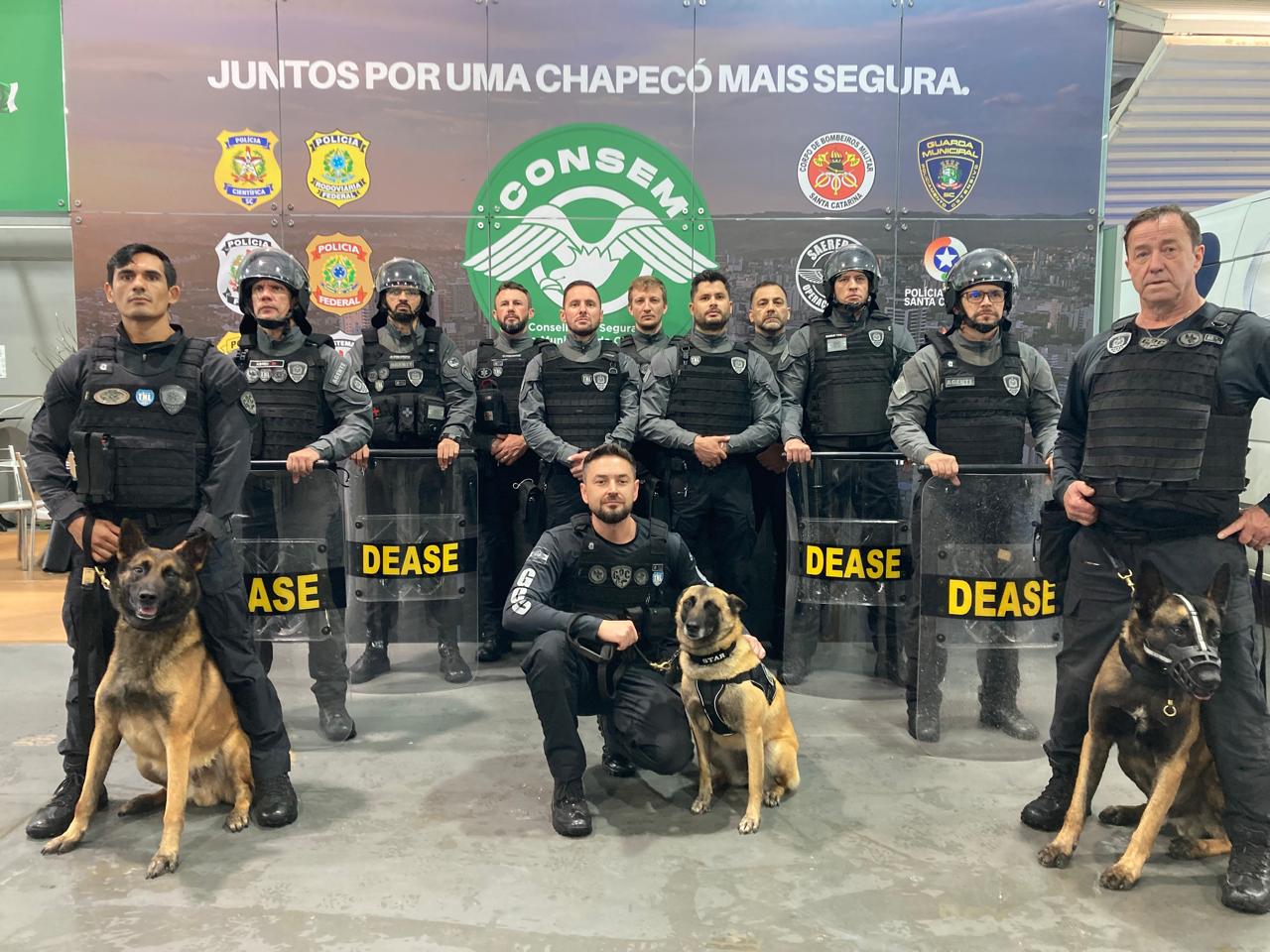 Além da presença institucional, o DEASE disponibilizou equipes especializadas para controle de distúrbios com instrumentos de menor potencial ofensivo, bem como agentes com cães de faro treinados para detecção de armas, drogas e localização de pessoas. As equipes do CASE Regional de Chapecó estão distribuídas em pontos estratégicos da feira — tanto em frente ao estande do CONSEM, onde estão expostas viaturas das forças policiais, quanto em patrulhamento pelos demais espaços.