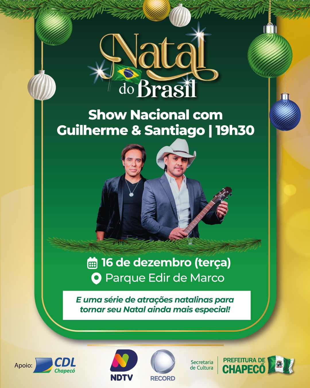 Entre os destaques da noite está o show da dupla Guilherme & Santiago, além de outras apresentações preparadas para celebrar o período natalino e incentivar a participação das famílias chapecoenses. A decoração e a iluminação do parque integram a programação de Natal promovida pelo município, com foco no lazer, na cultura e na valorização dos espaços públicos.