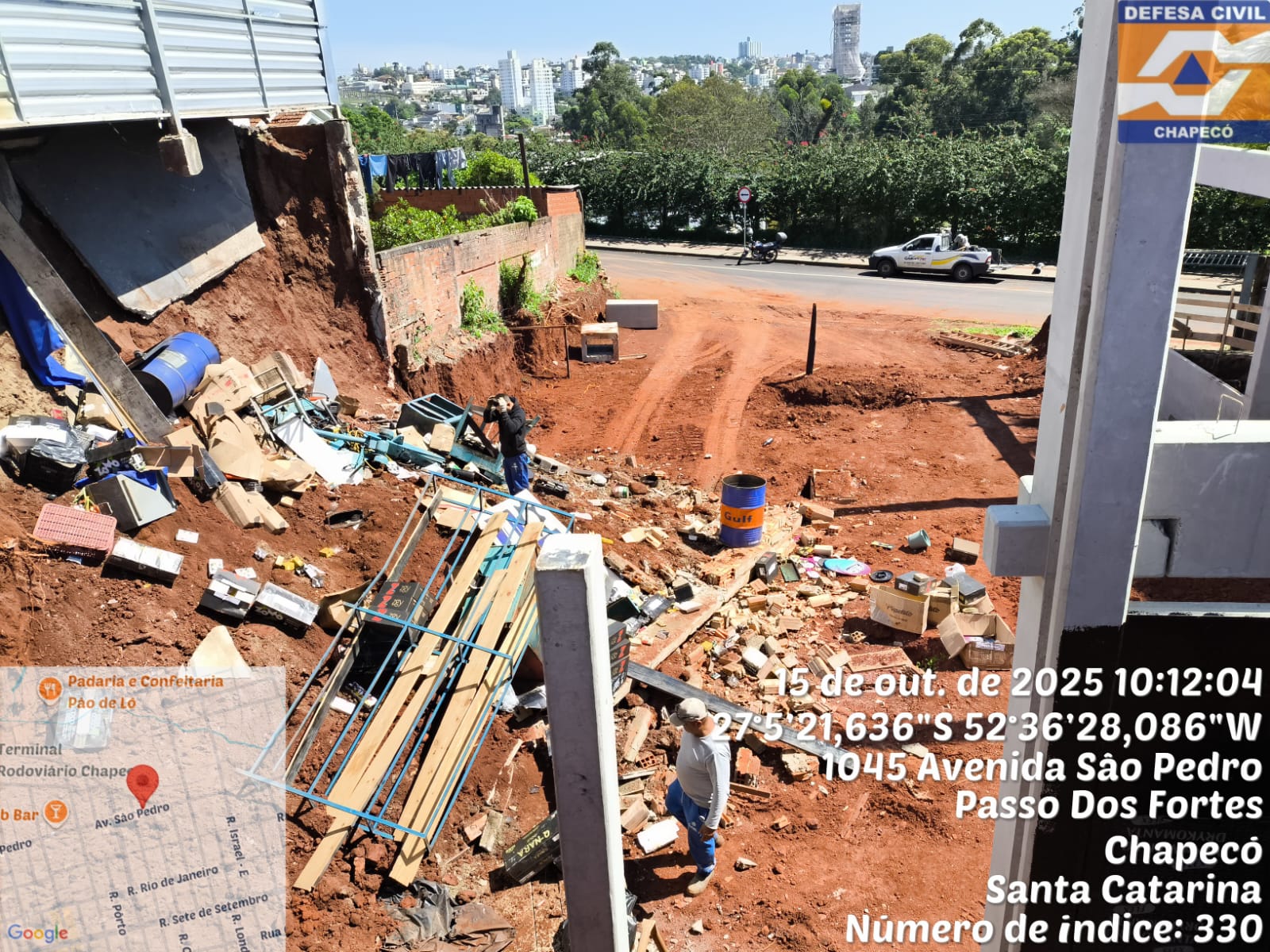 A Defesa Civil de Chapecó realizou na manhã desta quarta-feira (15) uma interdição cautelar em um imóvel localizado no bairro Passo dos Fortes, após constatar movimentação de solo e colapso parcial de estrutura na divisa entre as propriedades.