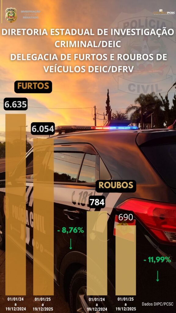 Furtos de veículos no estado: 2024: 6.635 casos | 2025: 6.054 casos | Redução: -8,76%