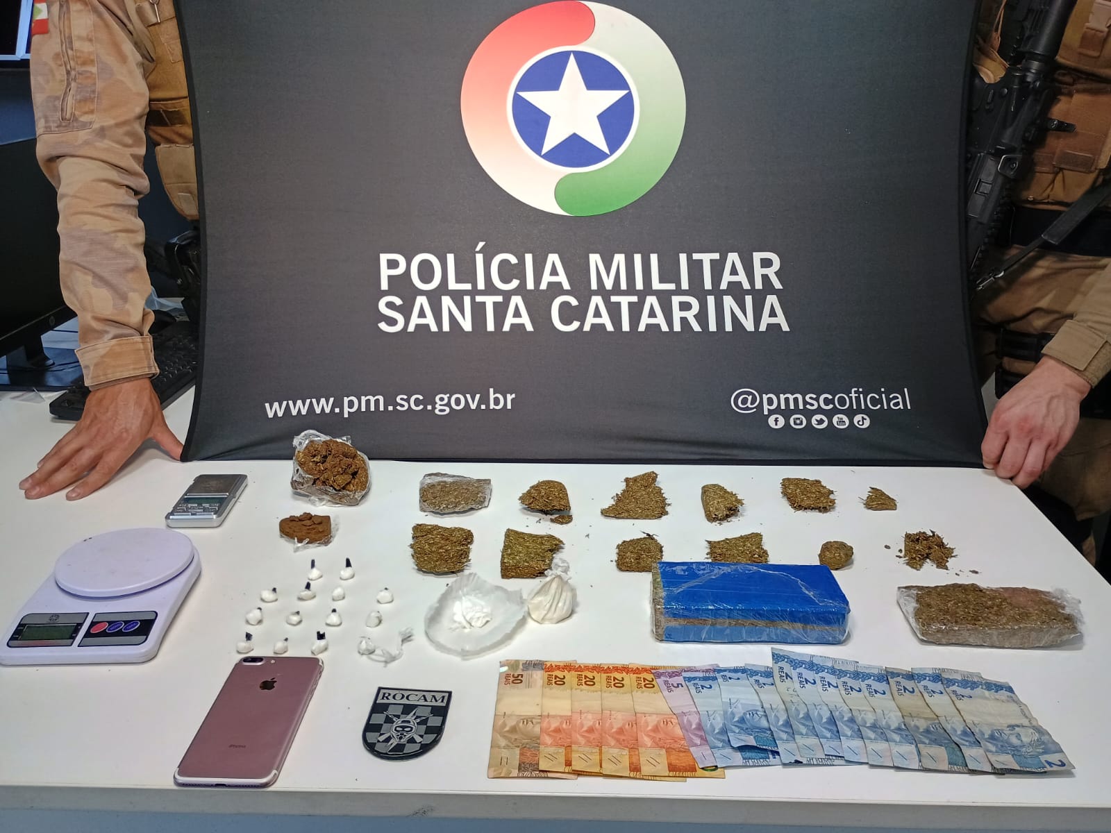 A guarnição deslocou até o endereço e encontrou o suspeito ao lado da residência, correspondendo às características repassadas. Durante a abordagem, foram localizados R$ 157,00 em notas fracionadas e um telefone celular. Questionado, o suspeito admitiu possuir drogas e uma balança dentro da casa, entregando parte do material espontaneamente.