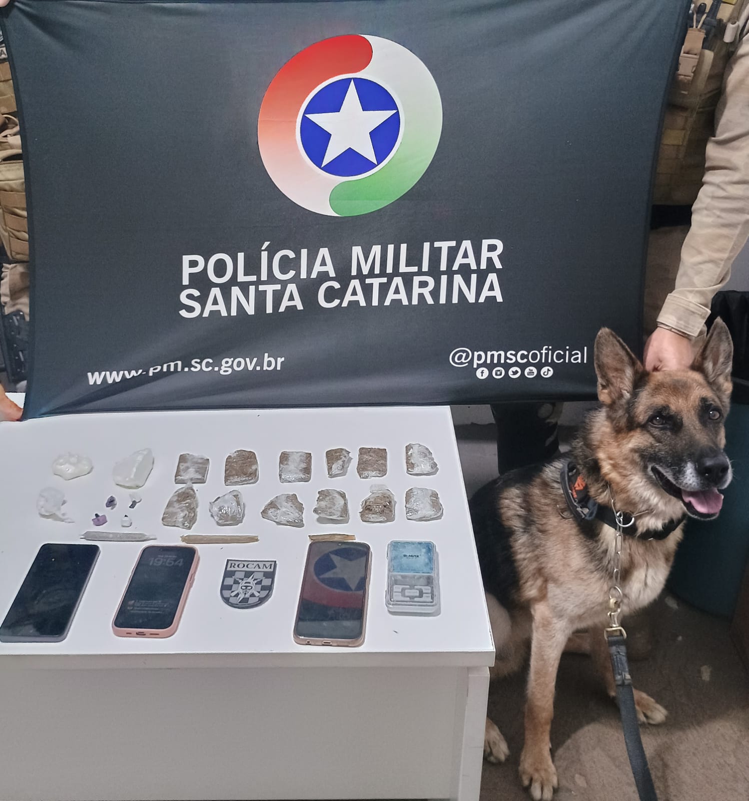 Durante as buscas na residência e nos fundos do imóvel, com apoio do Canil da Polícia Militar, foram apreendidos aproximadamente 172 gramas de maconha e 98 gramas de cocaína, parte da droga já fracionada e embalada para a venda, além de uma balança de precisão, três aparelhos de telefone celular e cigarros de maconha, evidenciando a prática do tráfico de drogas no local.