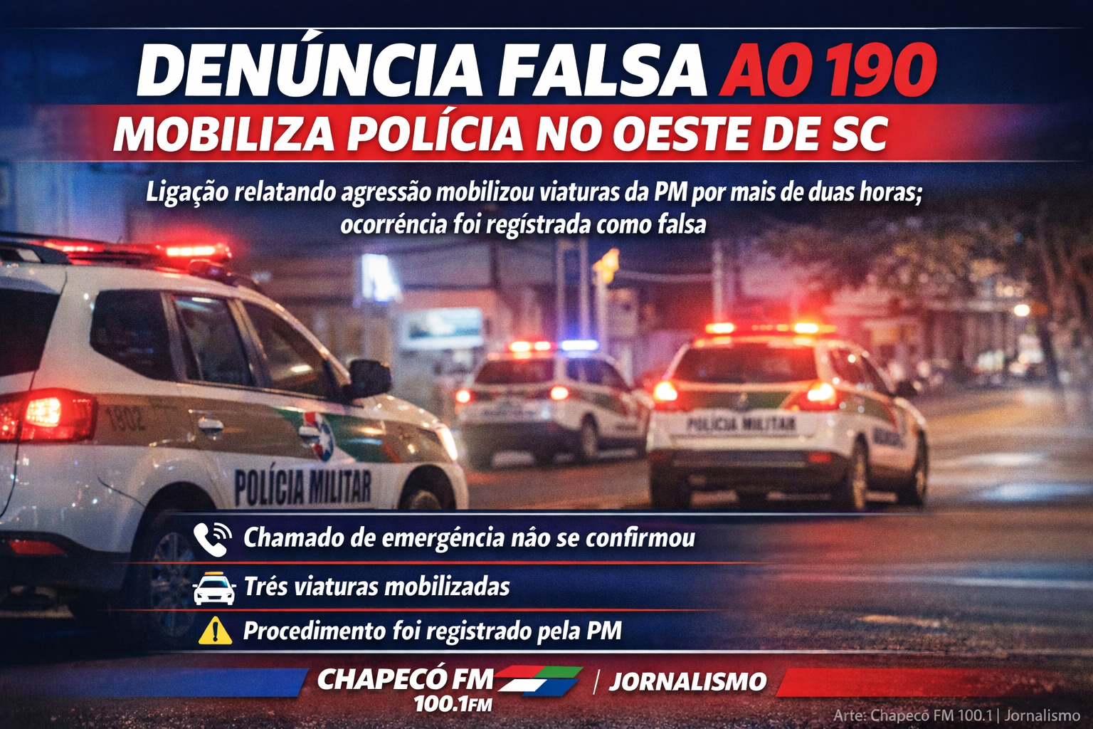 Uma denúncia falsa registrada por meio do telefone 190 mobilizou equipes da Polícia Militar na tarde de terça-feira (30), e gerou uma ocorrência que se estendeu por mais de duas horas em Chapecó. A situação foi registrada após uma ligação em que uma mulher afirmou estar sendo agredida com um pedaço de madeira e que estaria trancada no banheiro de uma residência, na rua São Marcos, no bairro Santa Maria.