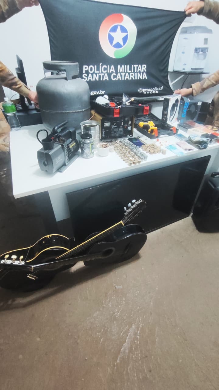 Com o apoio do canil, um cão farejador localizou ainda uma pedra de crack, pesando aproximadamente 4 gramas. Ao todo, foram apreendidos 10 buchas de cocaína, uma pedra de crack, uma balança de precisão, R$ 1.302 em dinheiro, além de diversos objetos, entre eles dois violões, um botijão de gás, um carregador de bateria automotiva, dois fones de ouvido, um lava-jato de alta pressão com compressor, uma caixa de som, uma televisão, uma furadeira, oito frascos de perfume e dois smartphones.