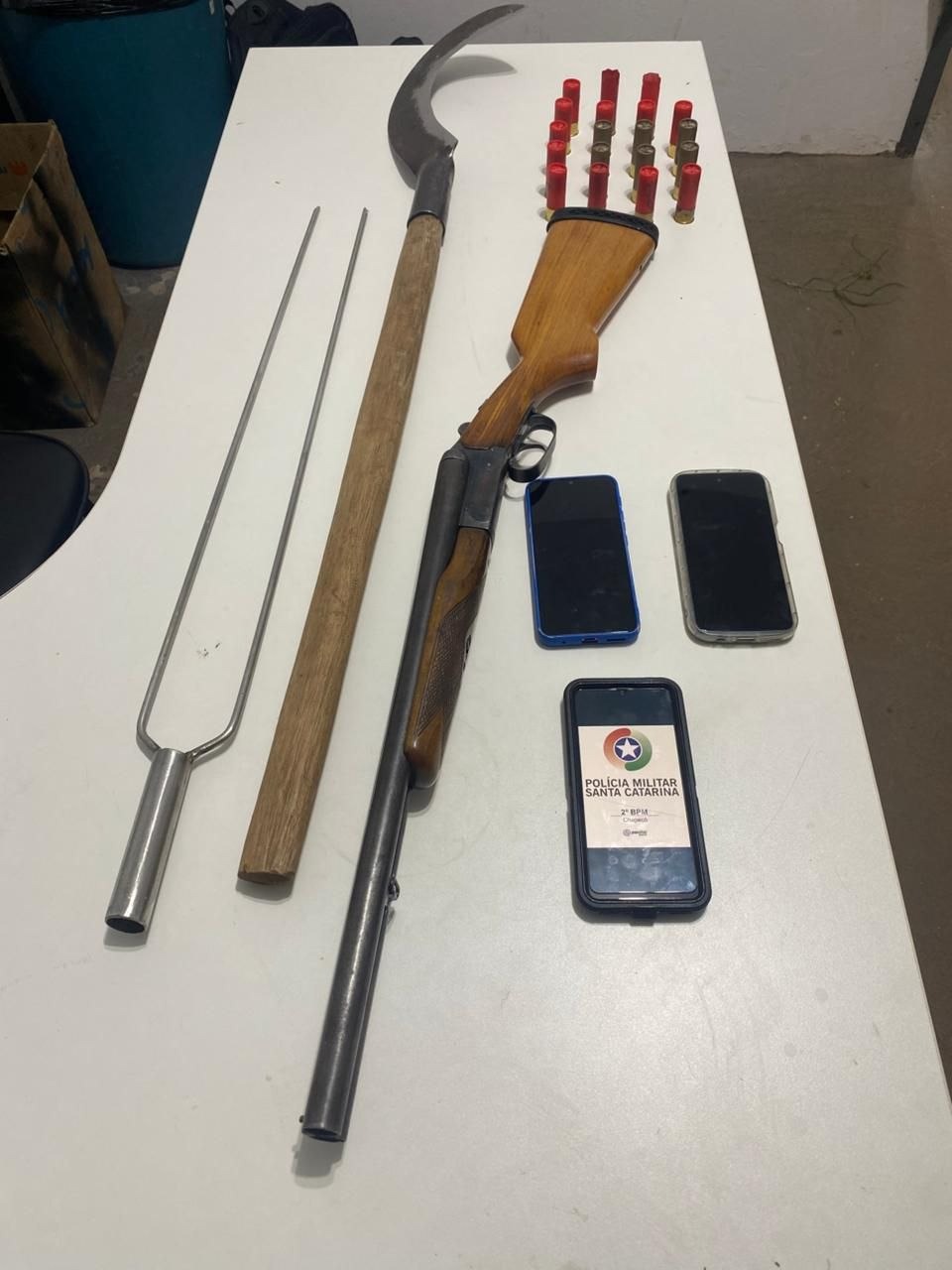 Ao todo, foram apreendidos uma espingarda calibre 12, 17 munições, dois estojos deflagrados, além de objetos utilizados nas ameaças e aparelhos celulares.