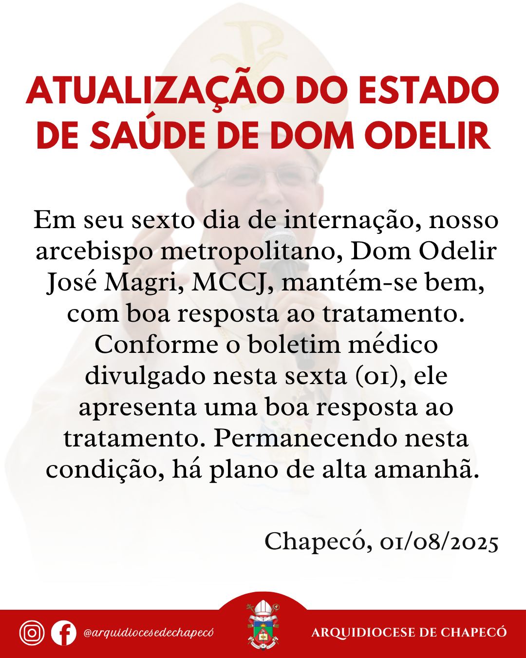 O estado de saúde de Dom Odelir José Magri, arcebispo metropolitano da Arquidiocese de Chapecó, apresenta evolução positiva após seis dias de internação. Segundo boletim médico divulgado nesta sexta-feira (1º), o religioso segue com boa resposta ao tratamento e há expectativa de alta hospitalar para este sábado (2), caso o quadro clínico se mantenha estável.