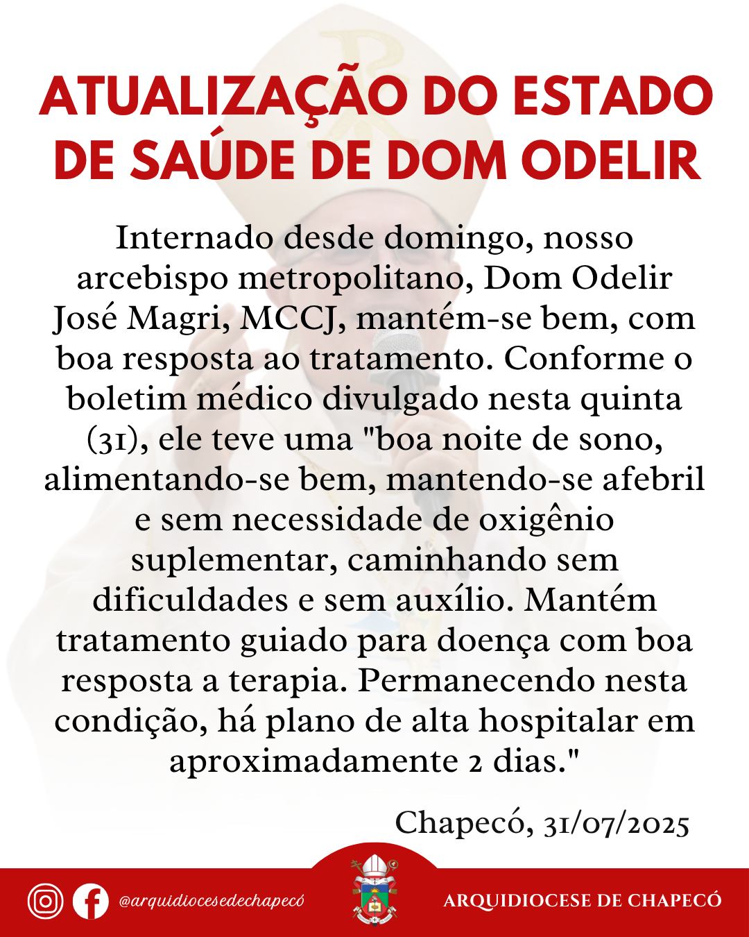 O comunicado oficial, emitido pela Arquidiocese de Chapecó, informa ainda que Dom Odelir está conseguindo caminhar normalmente, sem auxílio ou dificuldades, o que demonstra progresso em sua recuperação. Ele segue em tratamento para uma condição de saúde não especificada, mas com resposta positiva à terapia adotada.