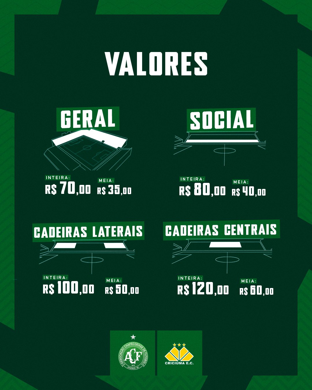 Arquibancada Descoberta (Geral): R$ 70,00 | Meia entrada: R$ 35,00