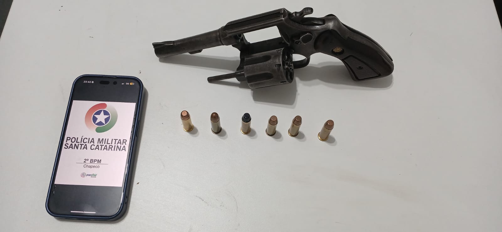Durante a busca, os policiais localizaram o objeto arremessado, um revólver calibre 38 com numeração raspada, com seis munições intactas.