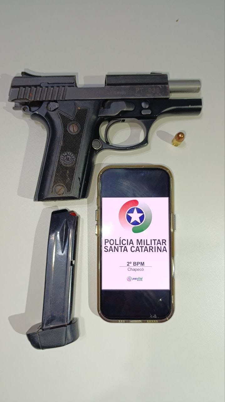 Durante a revista no veículo, foi localizada uma pistola calibre 380 (nº KBV68505) escondida sob o tapete do lado do motorista. Apesar de estar na parte da frente do carro, o armamento foi assumido pelo passageiro, que estava no banco traseiro.