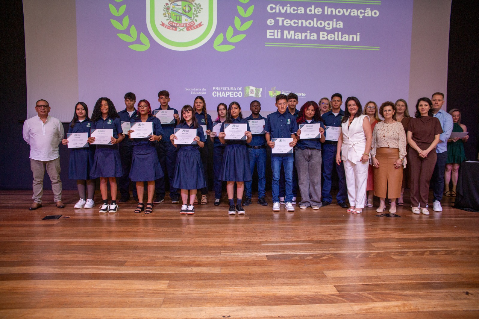 Na noite de quinta-feira (18), a EBM Cívica de Inovação e Tecnologia Eli Maria Bellani celebrou a formatura de suas primeiras turmas de 9º ano. A cerimônia foi realizada no Salão Nobre da Unochapecó e reuniu 150 estudantes, além de familiares, professores e equipe gestora.
