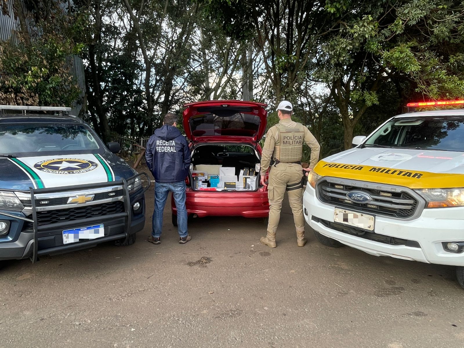 A abordagem foi realizada pela Polícia Militar Rodoviária (PMRv), em apoio à Receita Federal do Brasil (RFB). O veículo, um Peugeot/207, foi monitorado pelas equipes desde o trevo elevado de acesso a Chapecó até o momento da interceptação.