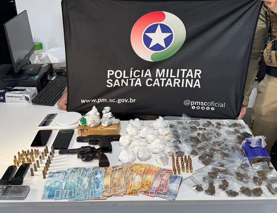 Já na outra residência, um suspeito de 21 anos tentou fugir ao perceber a presença policial, correndo para o interior do imóvel. Após abordagem e autorização para buscas, foram apreendidos 1,314 kg de crack, 632 gramas de maconha, 622 gramas de cocaína, um revólver calibre .38 municiado, além de munições e outros materiais utilizados no tráfico.