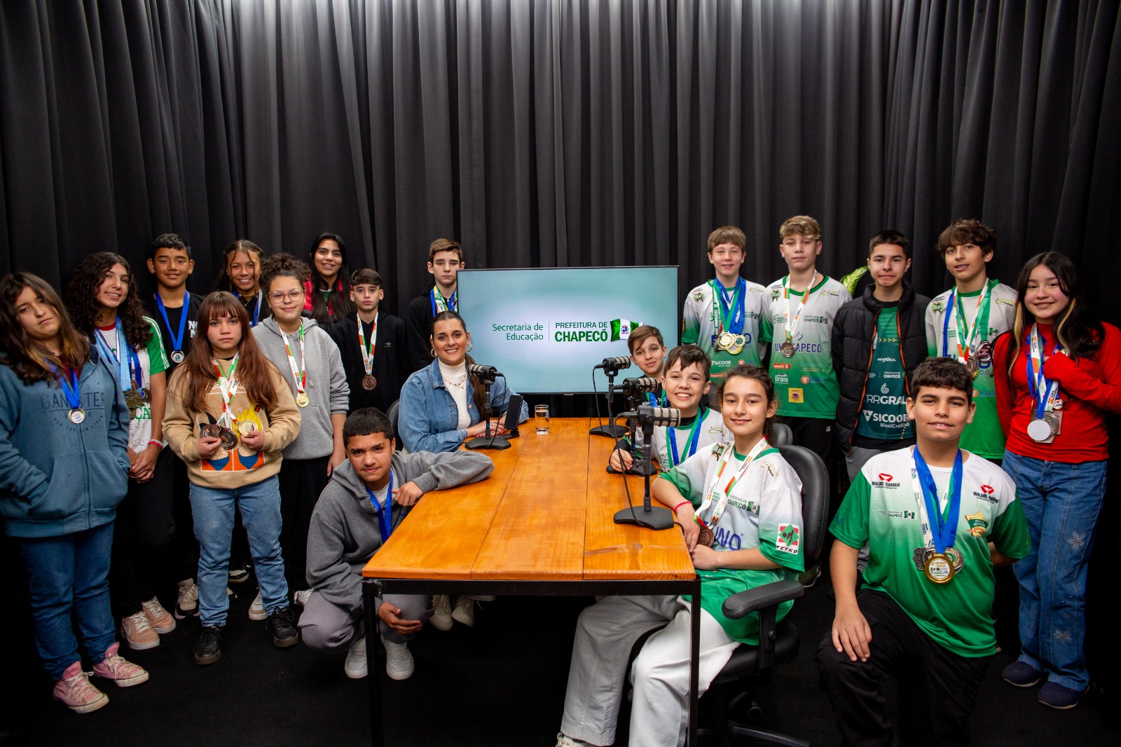 Os estudantes também participaram de um episódio especial do podcast da Secretaria de Educação, transmitido pelo canal Educa Chapecó Play no YouTube