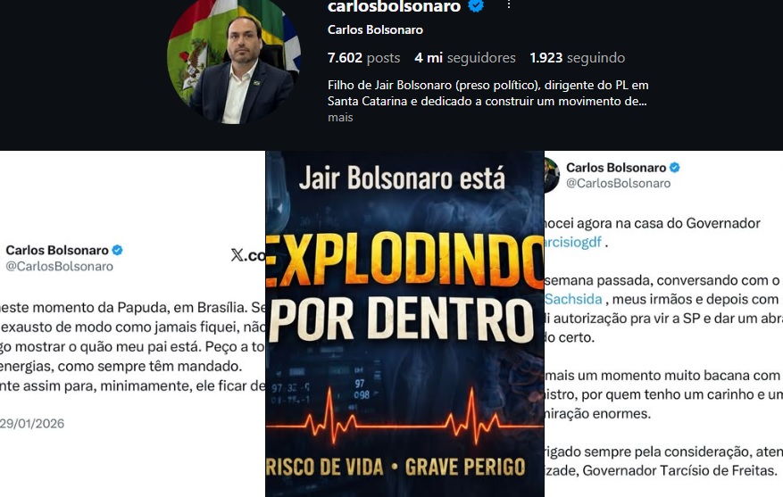 Na mais recente postagem que circula em redes de notícias, Carlos afirmou hoje que o corpo do ex-presidente estaria tão fragilizado que estaria “literalmente explodindo por dentro”, numa metáfora sobre a gravidade das condições físicas e o histórico de cirurgias e complicações que Bolsonaro enfrenta desde o atentado sofrido em 2018.