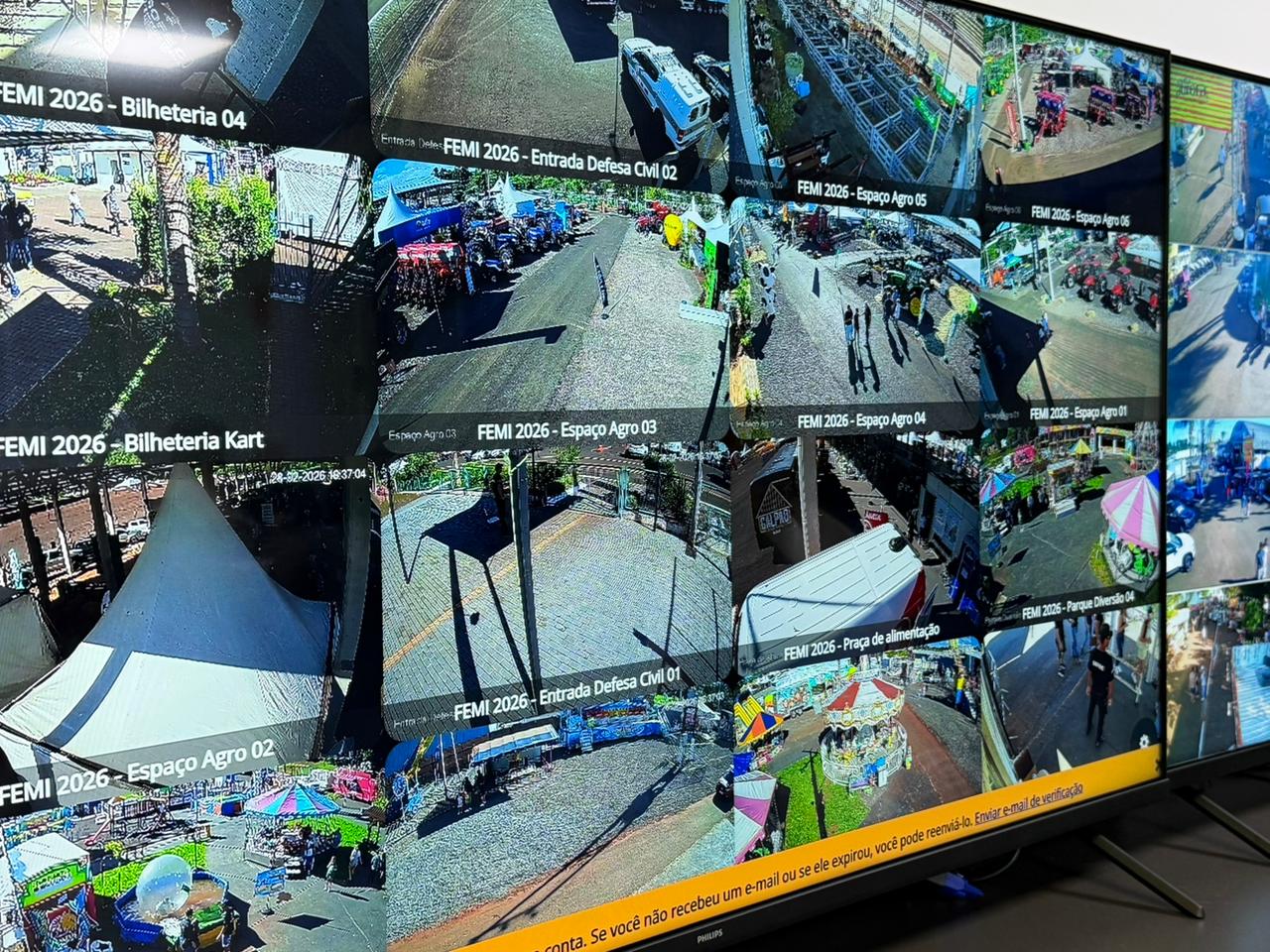 Uma das novidades da ExpoFemi neste ano é a implantação de uma central de monitoramento com câmeras espalhadas por todo o Parque de Exposições Rovilho Bortoluzzi. A estrutura funciona em tempo real e amplia o controle e a segurança durante os dias de evento.