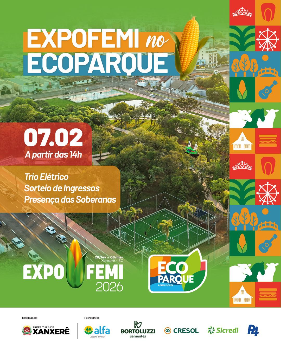 A ExpoFemi 2026 realiza, neste sábado (07), uma ação especial de aquecimento para a feira. A partir das 14h, o Ecoparque Municipal Romeu Scirea, em Xanxerê, recebe o evento “ExpoFemi no Ecoparque”, com atrações culturais, música e atividades voltadas a toda a população. O evento é gratuito e aberto ao público.