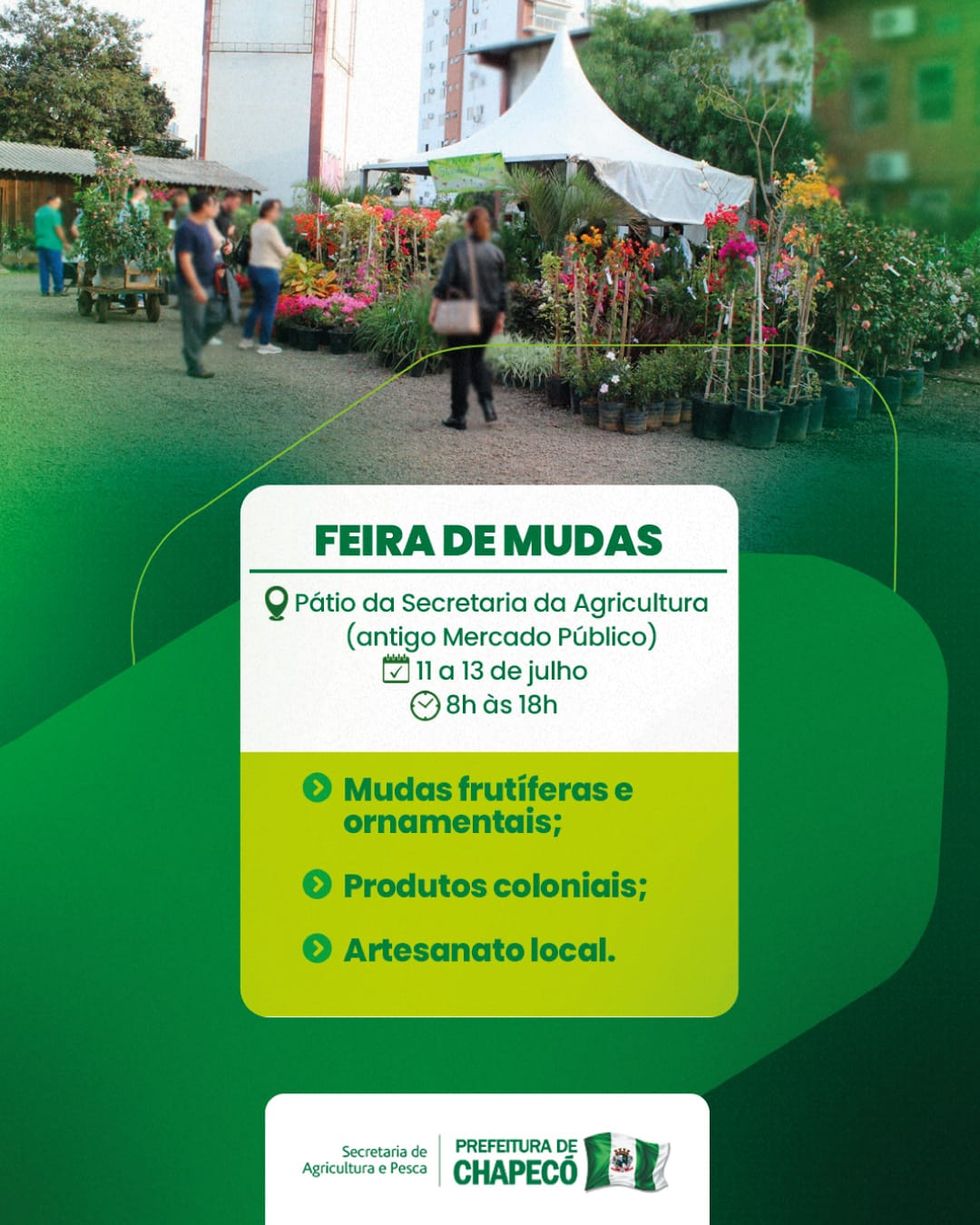Entre os dias 11 e 13 de julho, Chapecó será palco de mais uma edição da tradicional Feira de Mudas, que será realizada no pátio da Secretaria de Agricultura e Pesca, localizado no antigo Mercado Público. O evento acontece das 8h às 18h, com entrada gratuita.