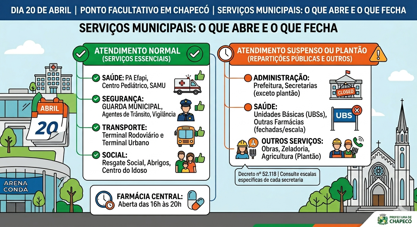 O Poder Executivo de Chapecó definiu ponto facultativo nas repartições públicas municipais no dia 20 de abril de 2026, segunda-feira, com manutenção de serviços essenciais e atendimento em regime especial em áreas estratégicas.