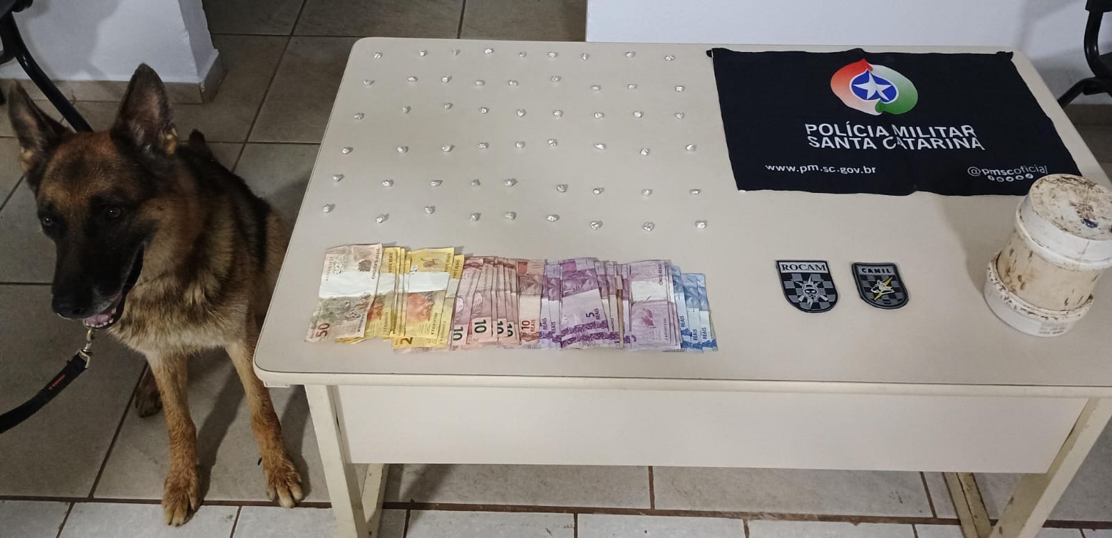 De posse das informações, os policiais foram até o local e abordaram o suspeito, encontrando com ele R$ 423,00 em notas fracionadas e quatro pedras de crack embaladas para venda. Com o apoio do CANIL, o cão farejador localizou mais 50 pedras da mesma substância escondidas na vegetação próxima. O entorpecente seria idêntico ao quer foi encontrado no bolso do abordado.