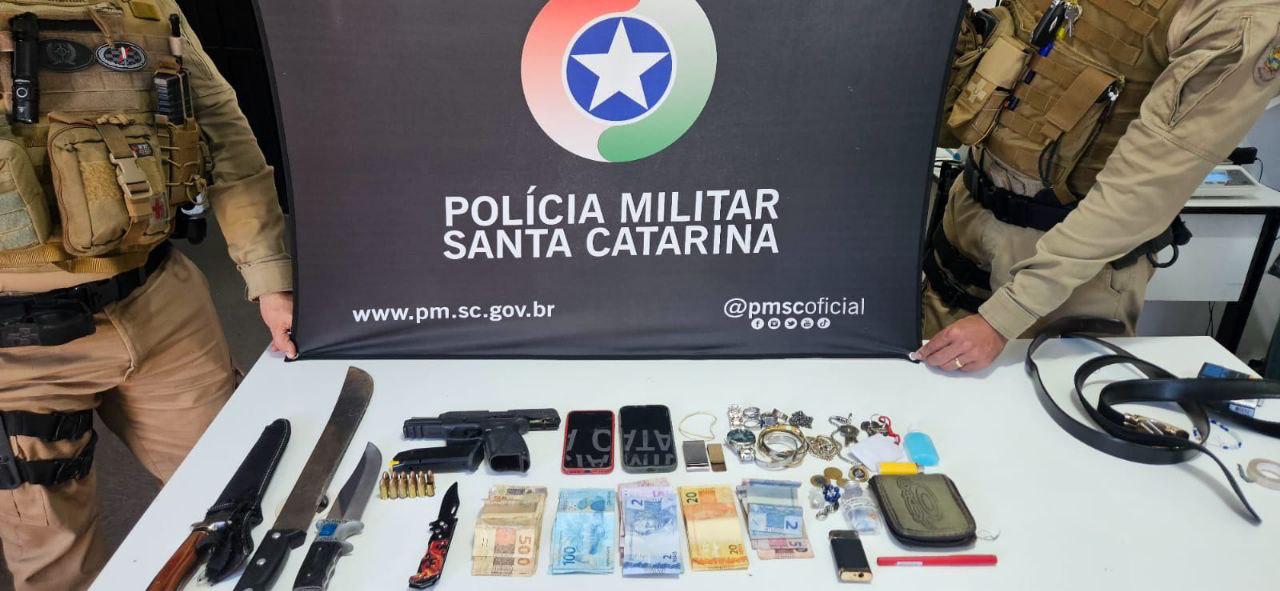 Durante a revista, foram encontrados um canivete, uma faca, um facão e outras duas facas dentro do veículo. Na sequência, os policiais retornaram ao ponto onde haviam perdido o carro de vista anteriormente e encontraram uma pistola calibre 9mm caída na calçada, com sinais de que teria sido arremessada durante a fuga.
