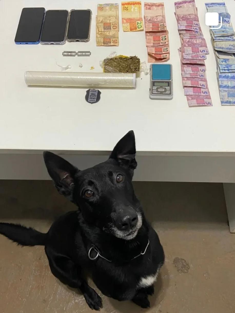 Com a constatação do flagrante, a entrada da guarnição foi autorizada. Com apoio do Grupamento de Operações com Cães (GOC), foram localizados aproximadamente 93,3 gramas de substância análoga à maconha, além de porções semelhantes a crack e cocaína. Também foram apreendidos materiais utilizados para o fracionamento e acondicionamento das drogas, uma balança de precisão, três aparelhos celulares e R$ 313,00 em dinheiro, em notas fracionadas.