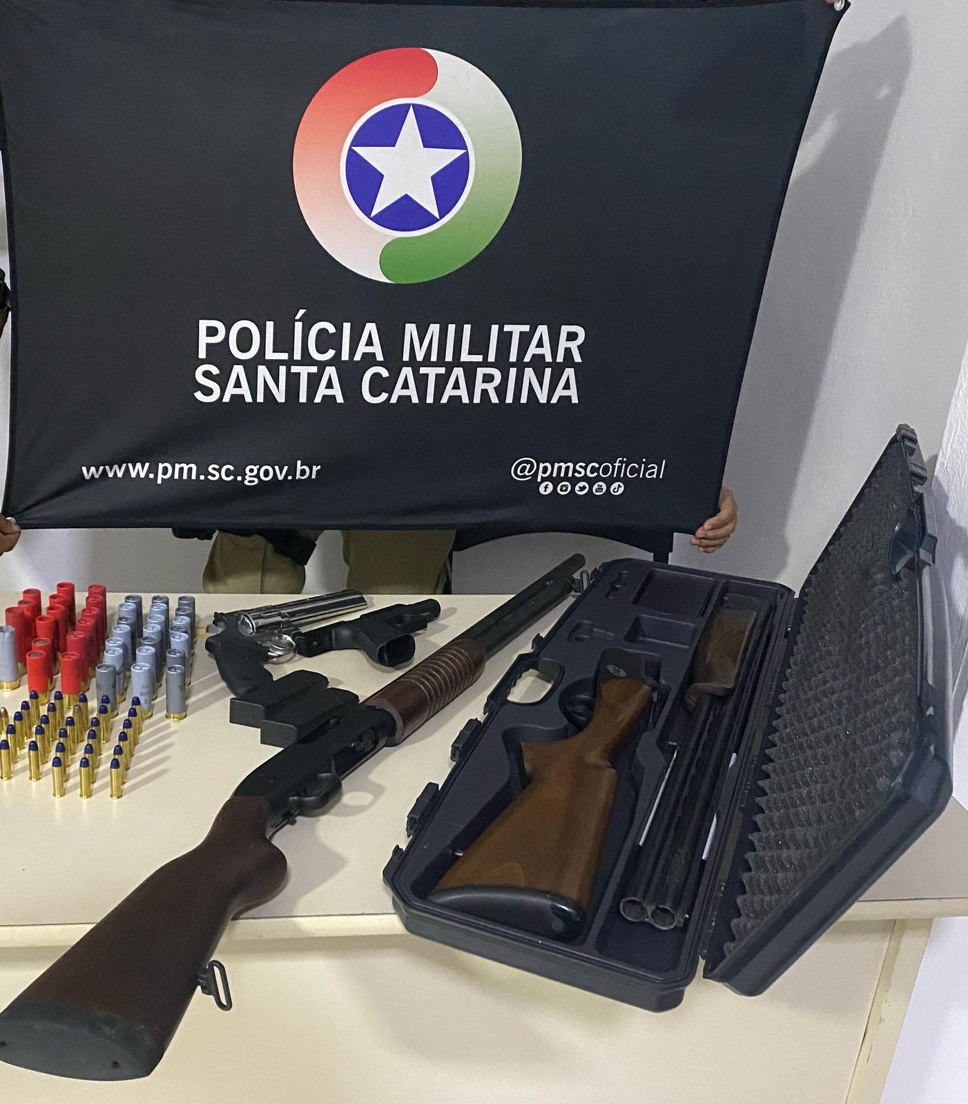 Durante o deslocamento, a PM recebeu novas informações indicando mais disparos. Ao chegar no local, os policiais avistaram o suspeito sentado na área da residência, com uma arma em mãos. Assim que percebeu a presença da viatura, ele jogou o armamento para o lado. Na abordagem, os policiais encontraram ao lado dele um revólver calibre 357. Ao ser questionado, o homem confirmou que havia mais armas no veículo, sendo duas espingardas calibre 12, além de 28 munições calibre 357 intactas, 3 munições 9mm intactas, 38 munições calibre 12 intactas, 2 deflagradas, um carregador Glock 9mm e uma pistola Glock, também 9mm, que foi encontrada municiada com duas munições intactas, arremessada em meio à vegetação próxima.