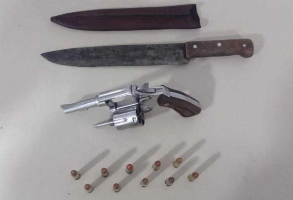 Após buscas nas proximidades, a guarnição localizou o suspeito em posse de uma faca e um revólver calibre 38, marca Rossi. O homem negou as agressões, alegando que a discussão começou com o cunhado e que sua esposa teria se machucado ao cair de uma escada molhada durante a tentativa de intervir.