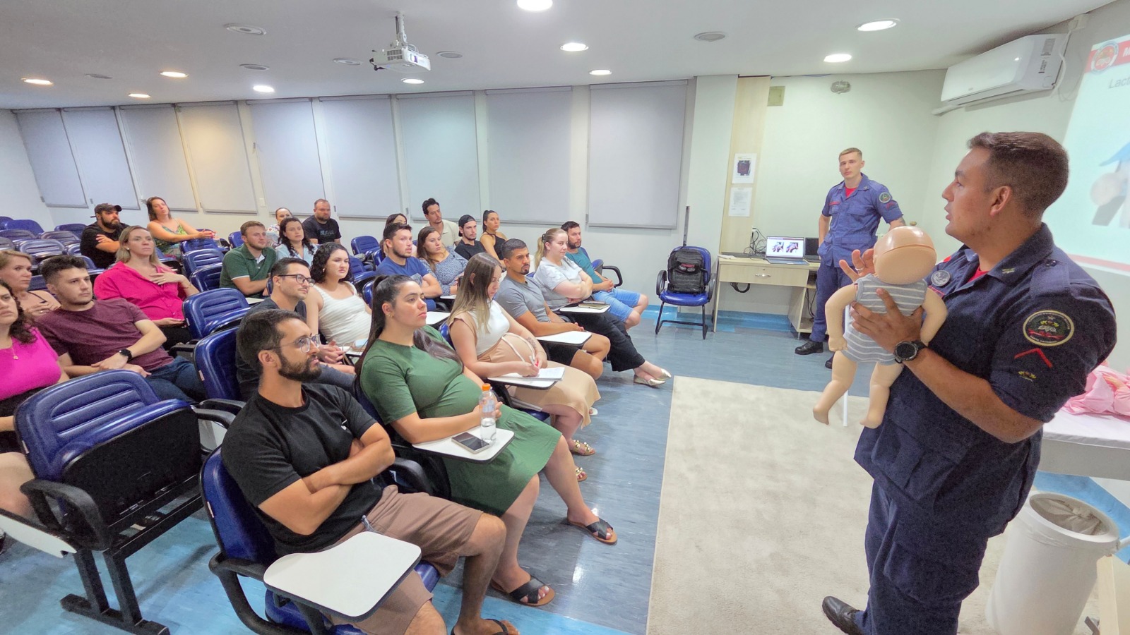 No segundo encontro, o foco foi voltado aos cuidados práticos com o bebê, incluindo demonstrações de banho, troca de fraldas e higiene do coto umbilical. O Corpo de Bombeiros Militar de Santa Catarina participou da programação com treinamentos de primeiros socorros e manobras de desengasgo, ampliando a preparação das famílias para situações de emergência.