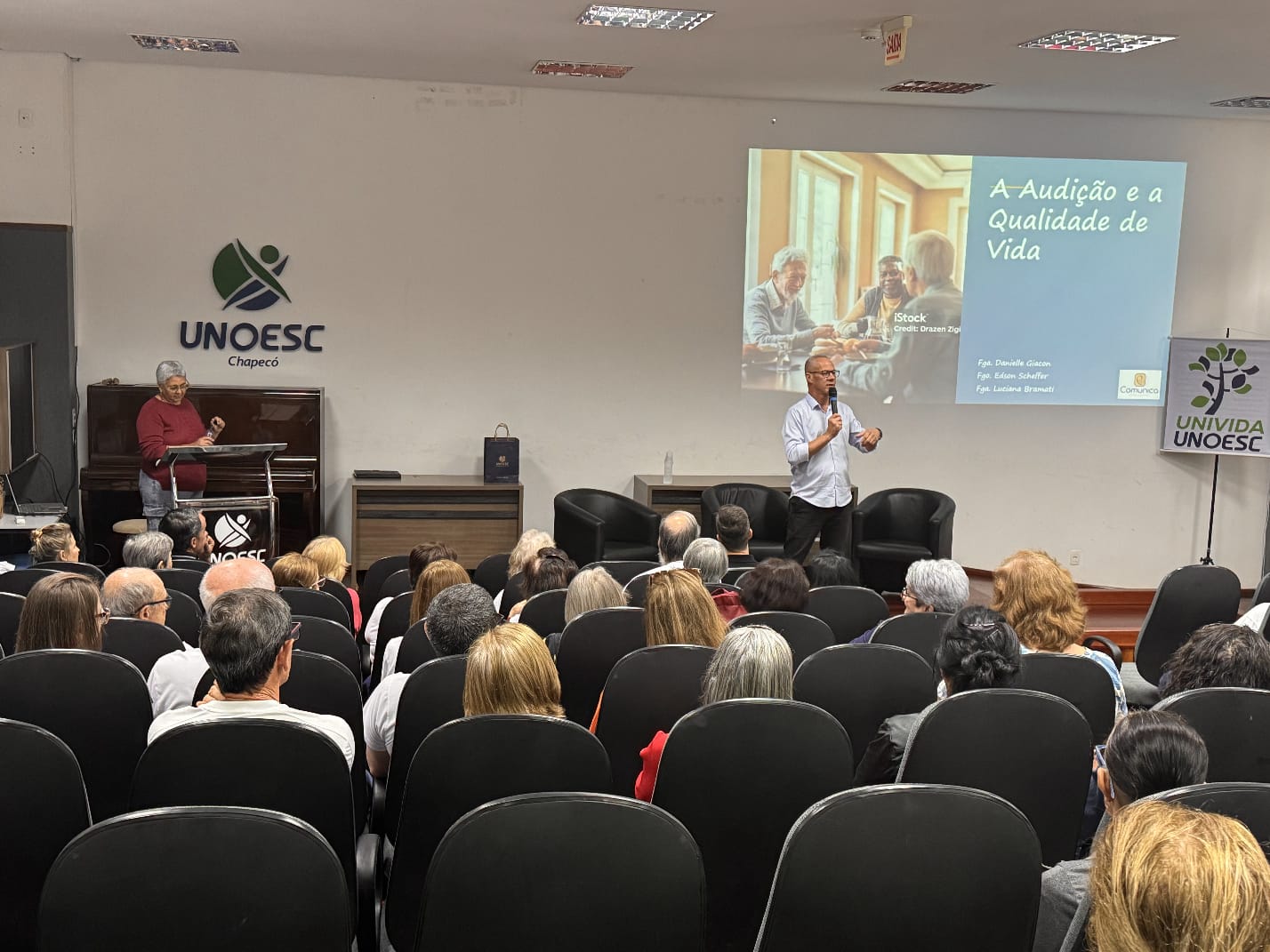 Alunos do Programa Universidade do Idoso, criado pela Prefeitura de Chapecó e executado em parceria com a Unoesc, participaram nesta terça-feira (29) da palestra “Audição e qualidade de vida”, na universidade.