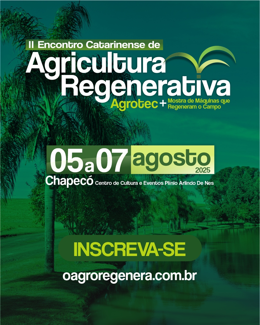 A Prefeitura de Chapecó, será uma das realizadoras do II Encontro Catarinense de Agricultura Regenerativa, que acontece de 05 a 07 de agosto, no Centro de Eventos Plinio Arlindo de Nes. Os temas a serem abordados são a sucessão na sustentabilidade, agricultura regenerativa, transição agroecológica na pecuária, uso de Sistema de Plantio Direto de Hortaliças e, ainda, o potencial e os desafios do carbono na agricultura.