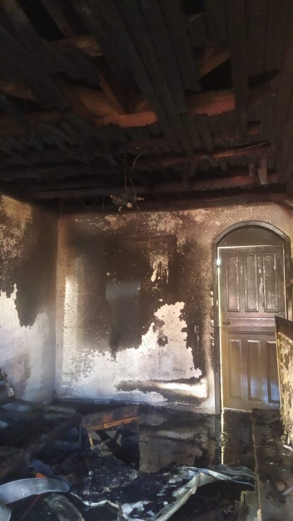 Quando as equipes chegaram, o fogo já tomava conta da sala de estar de uma casa de alvenaria com cerca de 70 metros quadrados. O incêndio destruiu móveis, o forro de madeira e parte do telhado.