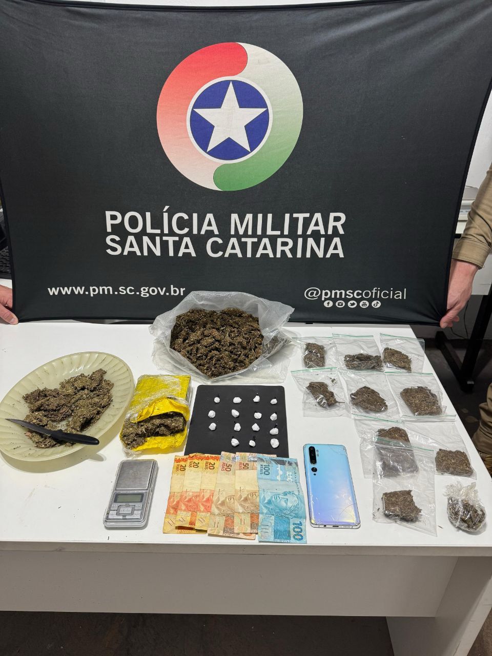 Com autorização do responsável pela residência, os policiais realizaram buscas no local, onde localizaram diversas porções de maconha, um tablete da droga, maconha do tipo camarão, buchas de cocaína, uma balança de precisão e dinheiro em espécie. Ao todo, a apreensão ultrapassou um quilo de entorpecentes.