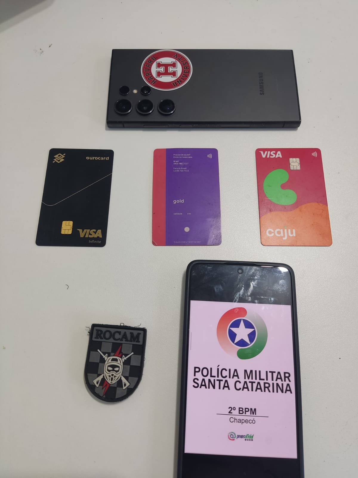 Durante a revista, foi localizado com ele o celular da vítima, além de alguns cartões de crédito que ele teria tentado usar no comércio. A mulher reconheceu o homem como autor do roubo.