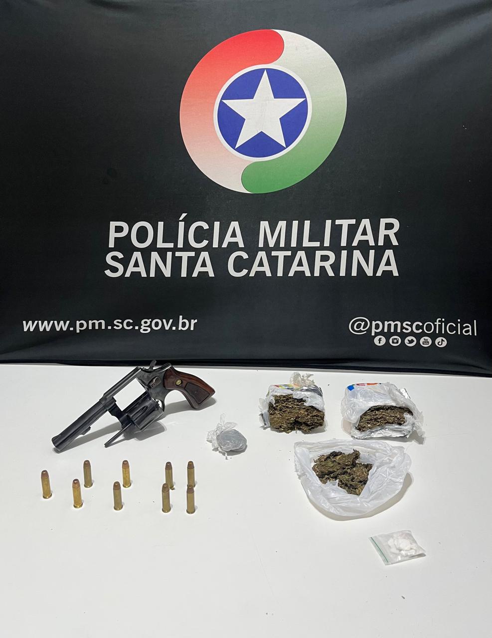 Durante buscas no veículo, foi encontrado um revólver calibre .38 municiado, além de pequenas porções de maconha e cocaína. O suspeito informou que possuía mais drogas em sua residência, no município de Xaxim.