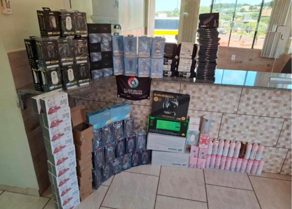 Durante a vistoria no automóvel, os policiais encontraram diversas mercadorias armazenadas em sacolas, malas e mochilas no porta-malas do carro. Entre os itens apreendidos estavam aproximadamente 76 mouses de diferentes modelos e marcas, 16 fones de ouvido, três teclados, 30 luvas e 29 cosméticos.