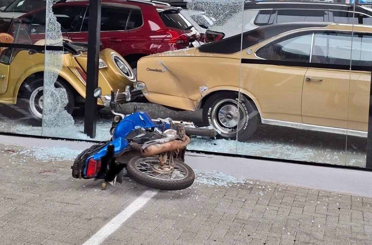 De acordo com os socorristas, a vítima relatou que trafegava pela via quando foi atingido na traseira por outro veículo. Com o impacto, perdeu o controle da motocicleta, atravessou o canteiro central e acabou invadindo o pátio da loja de veículos, localizada na esquina da mesma rua. Durante a colisão, a vidraça do estabelecimento foi quebrada e um carro exposto no local foi atingido.