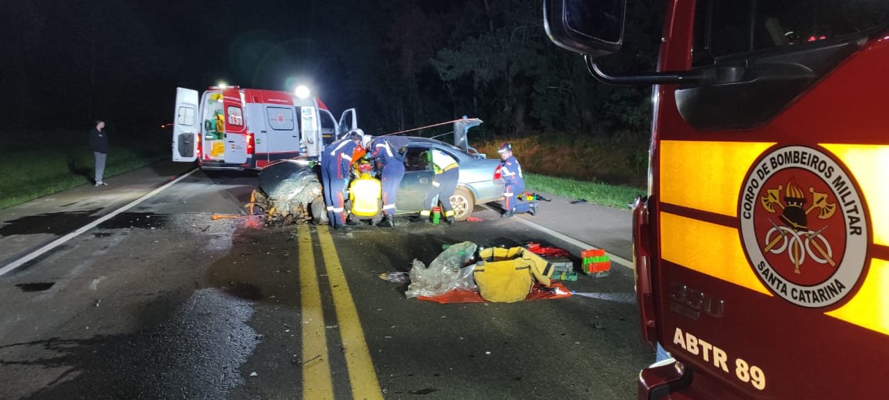 Na noite deste domingo (19), um acidente de trânsito mobilizou equipes de resgate na BR-282, na comunidade de Colônia Bacia, em Chapecó. Segundo informações do Corpo de Bombeiros Militar, uma colisão frontal envolveu uma camionete S10 e um veículo de passeio GM Vectra.