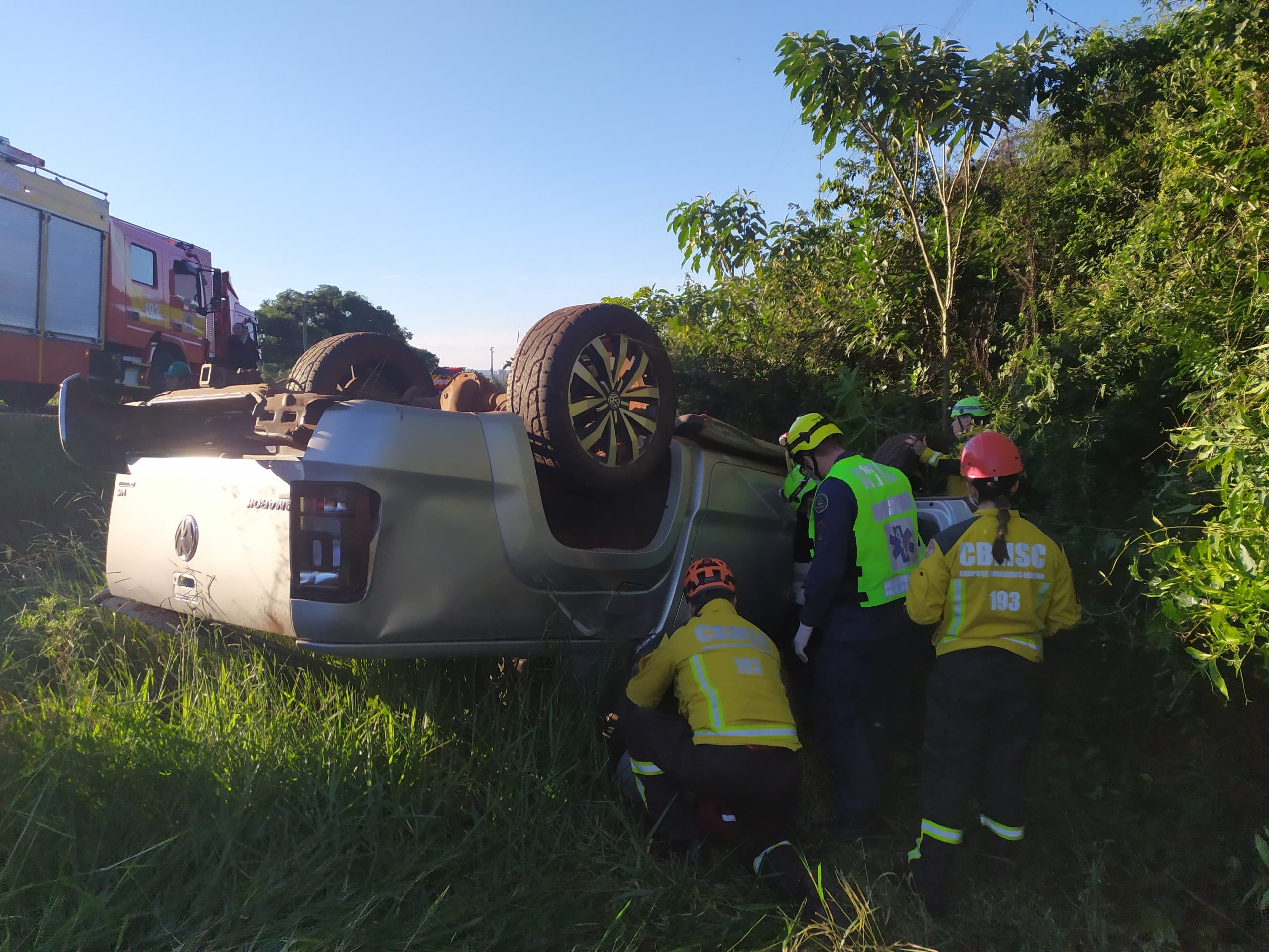 Um acidente de trânsito foi registrado na tarde deste sábado (3) na SC-155, em Xanxerê, no Oeste de Santa Catarina. O condutor de uma caminhonete VW/Amarok perdeu o controle da direção, saiu da pista e o veículo capotou às margens da rodovia, na saída para a cidade de Bom Jesus.