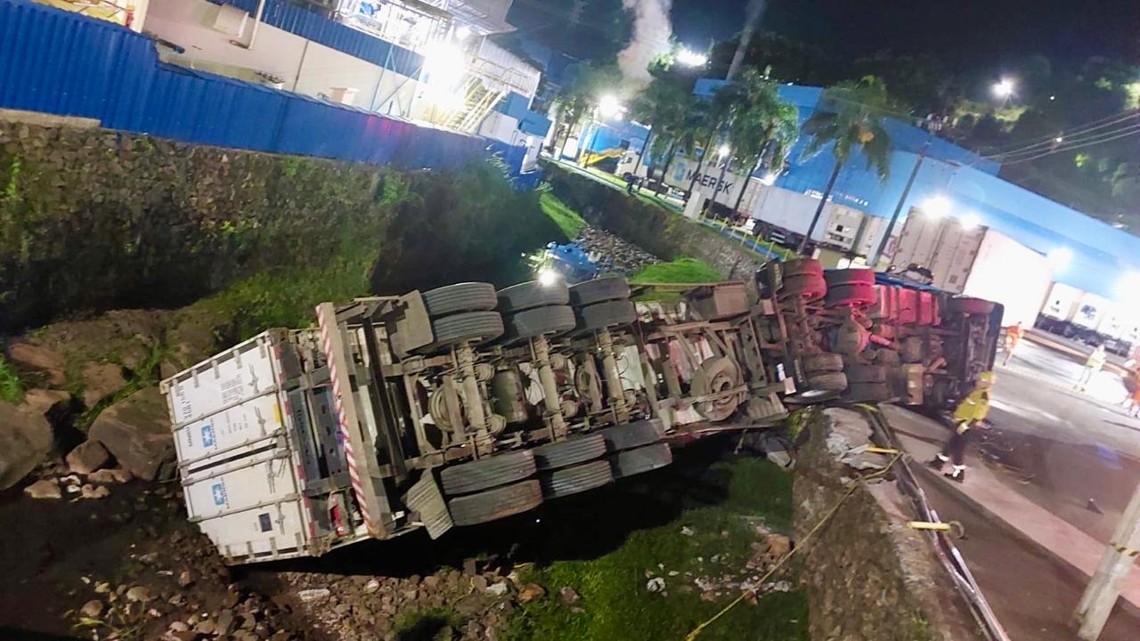 De acordo com informações do Corpo de Bombeiros Militar, uma carreta carregada de carne se movimentou inesperadamente durante o procedimento de engate do semirreboque ao cavalo mecânico. O motorista tentou entrar na cabine para impedir o deslocamento do veículo, mas acabou sendo atingido e ficou preso sob a cabine, que tombou parcialmente entre o rio e o estacionamento da empresa.