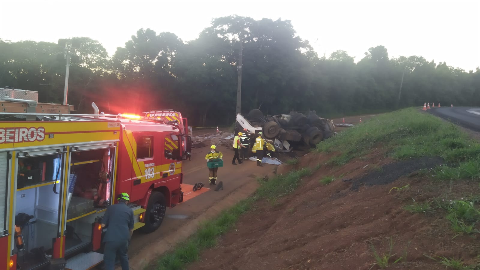 Ao chegarem ao local, os bombeiros encontraram o condutor, um homem maior de idade, já em óbito. Ele estava preso entre o teto da cabine e o solo, após ser ejetado do veículo durante o capotamento.