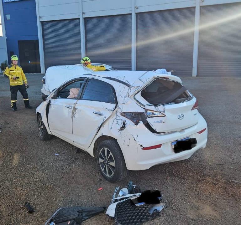 No local, os socorristas constataram que um Hyundai HB20 havia saído da pista e capotado na margem da rodovia. Conforme a dinâmica relatada, a condutora – uma mulher maior de idade – seguia no sentido sul/norte quando perdeu o controle da direção, resultando na saída de pista seguida de capotamento.