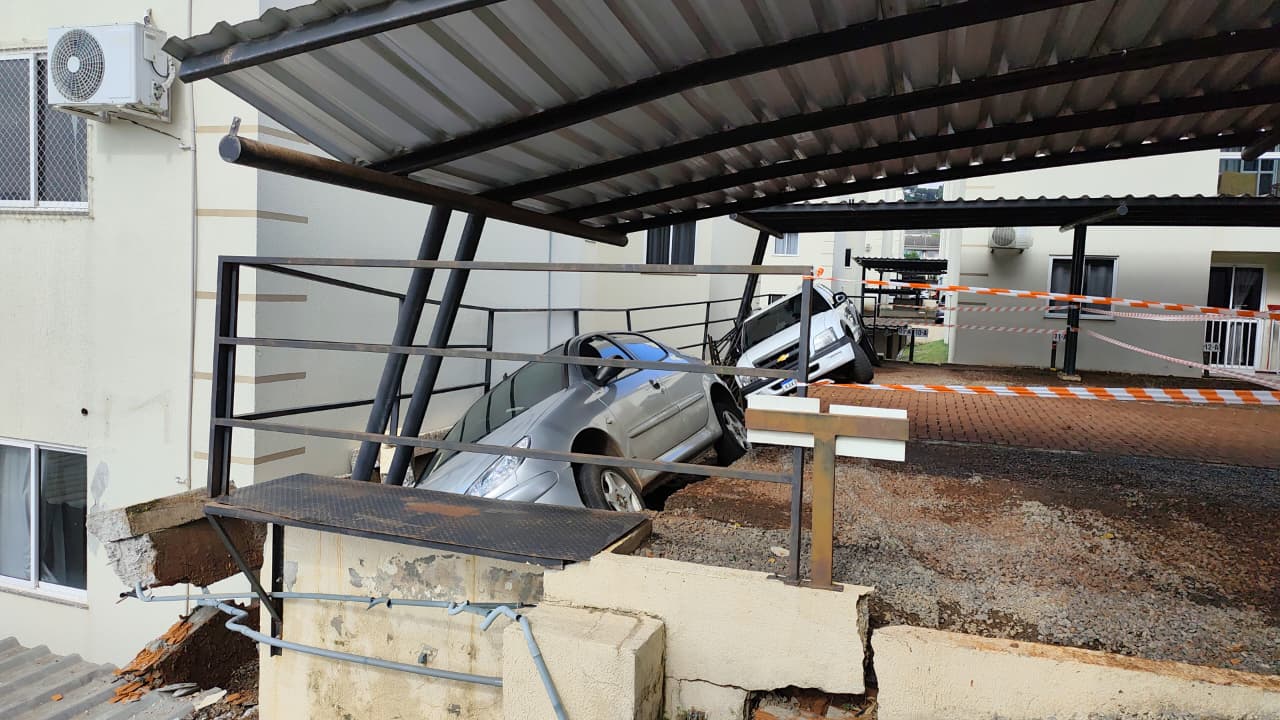 Na madrugada desta terça-feira (02), parte do muro do Residencial Vitória, no loteamento Alice I, na grande Efapi, cedeu após aproximadamente dez minutos de chuva torrencial. A estrutura que sustentava a garagem não resistiu à força da água, e dois veículos acabaram caindo com o deslizamento.