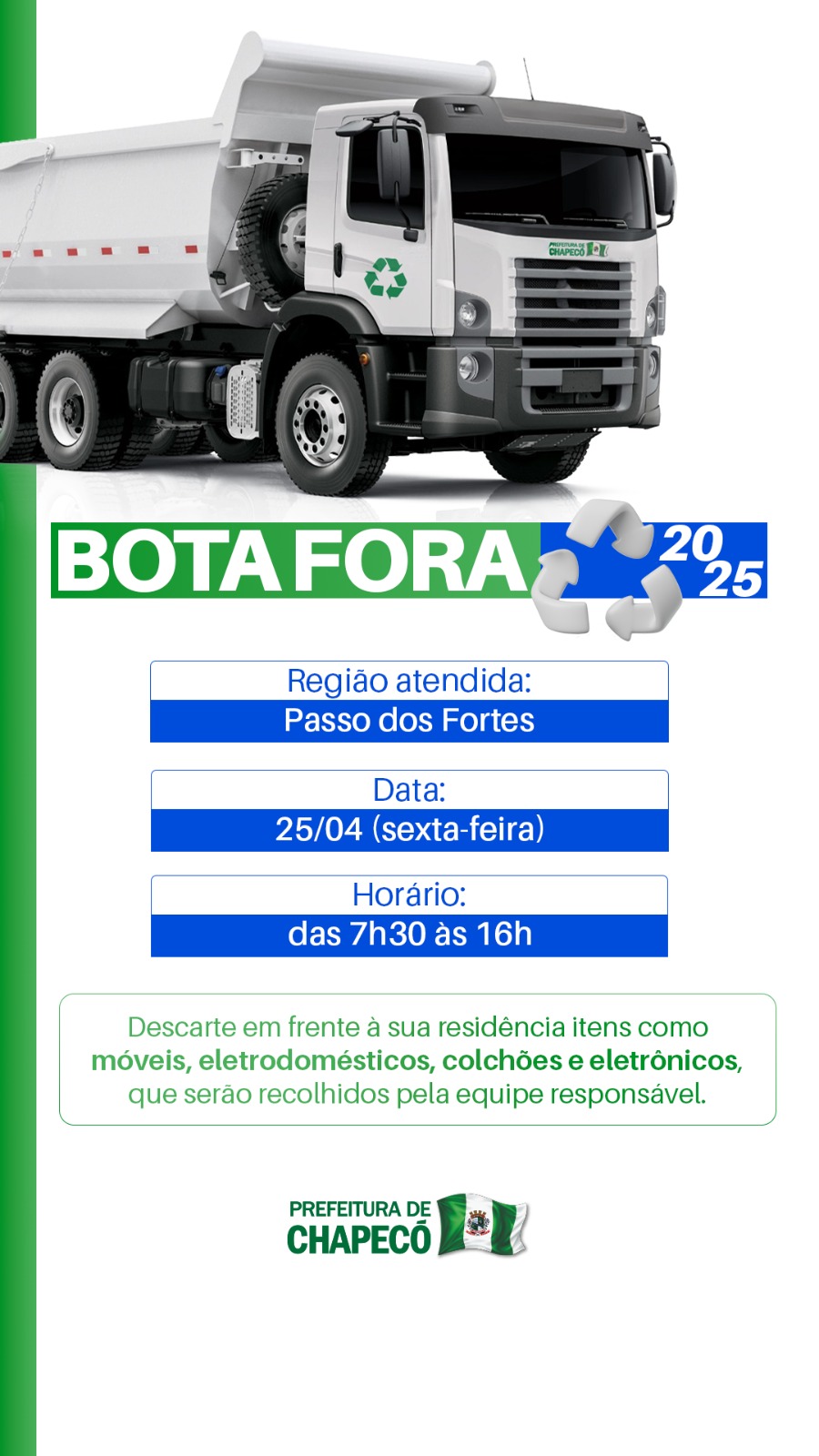 A Prefeitura de Chapecó realiza nesta sexta-feira, 25 de abril, mais uma etapa do programa “Bota-Fora 2025”. Desta vez, a ação acontece no bairro Passo dos Fortes, com atendimento das 7h30 às 16h.