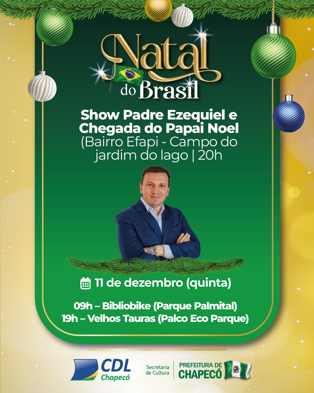 A programação do “Natal do Brasil” em Chapecó terá nesta quinta-feira, 11 de dezembro, uma série de atividades que incluem o show do Padre Ezequiel e a tradicional chegada do Papai Noel, programados para às 20h no Campo do Jardim do Lago, no Bairro Efapi. As ações fazem parte da agenda organizada pela Prefeitura de Chapecó, em parceria com a Secretaria de Cultura e a CDL, com o objetivo de fortalecer o espírito natalino e levar entretenimento às comunidades.