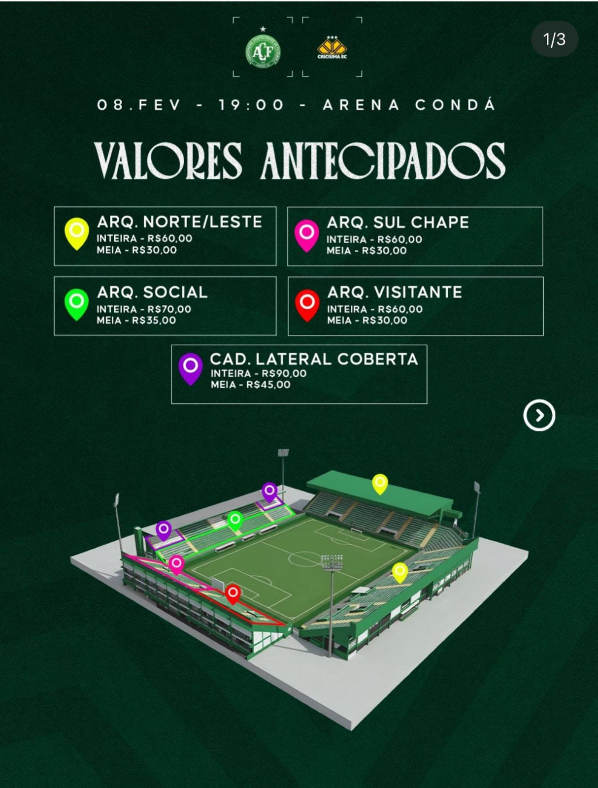 Arquibancada Sul-Chapecoense: R$ 70,00 | Meia-entrada: R$ 35,00