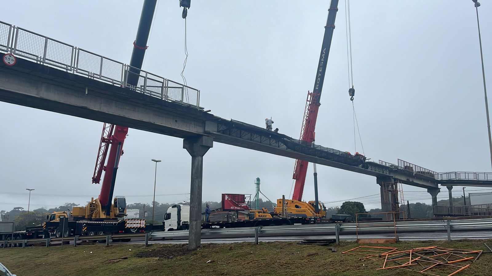 A reinstalação de uma passarela, derrubada por um caminhão em janeiro deste ano, modifica o trânsito na BR 480, acesso a Chapecó. Na ocasião, o veículo transportava carga especial e chocou-se com a estrutura.
