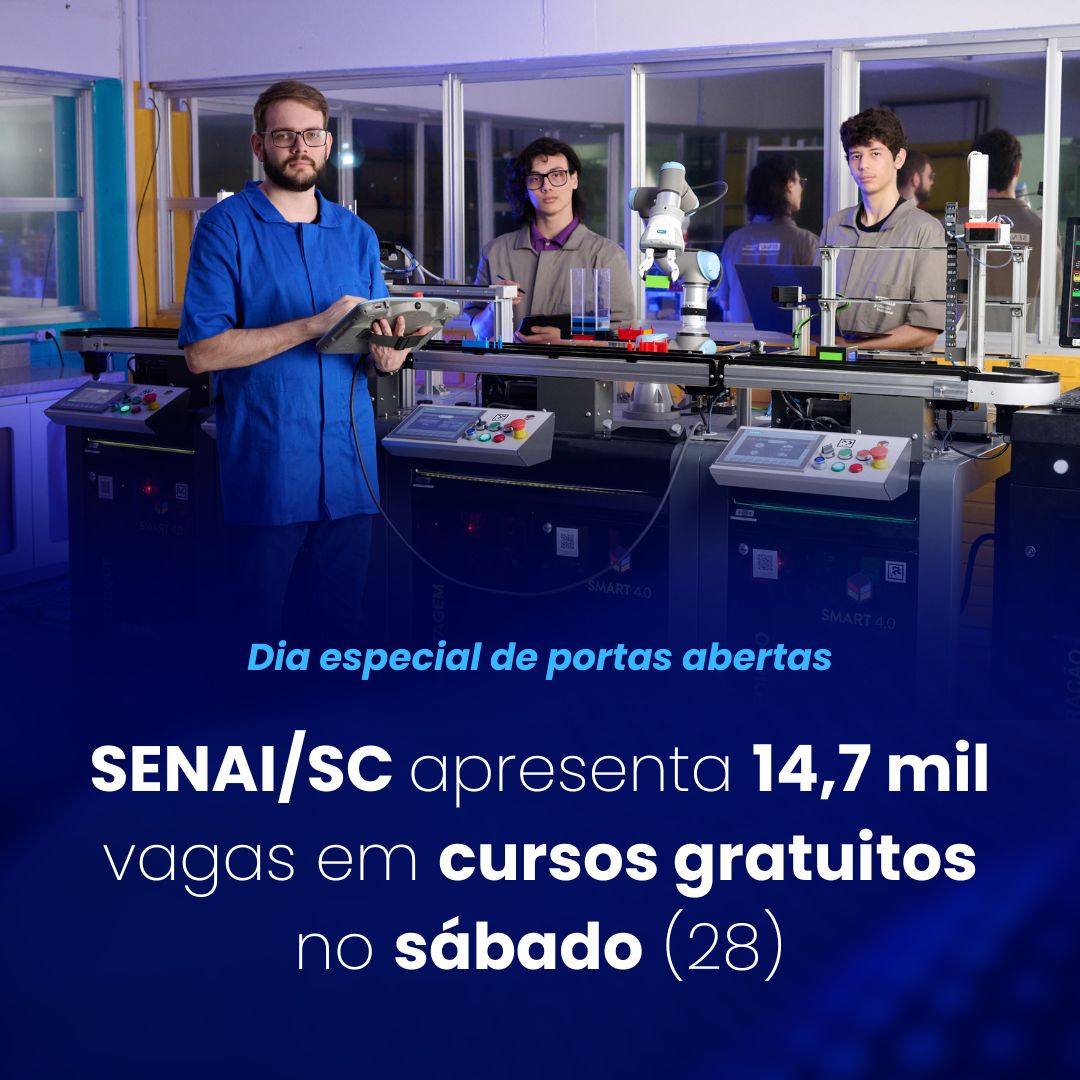 As oportunidades estão distribuídas nas unidades de Chapecó, Xanxerê, São Miguel do Oeste, São Lourenço do Oeste, Pinhalzinho e Maravilha. Neste sábado (28), o SENAI promove o Arena SENAI, evento de portas abertas realizado das 9h às 17h em 45 cidades catarinenses. A programação inclui mini oficinas, demonstrações tecnológicas, mostra de projetos e visitação aos laboratórios, além de orientações com professores sobre o mercado de trabalho.